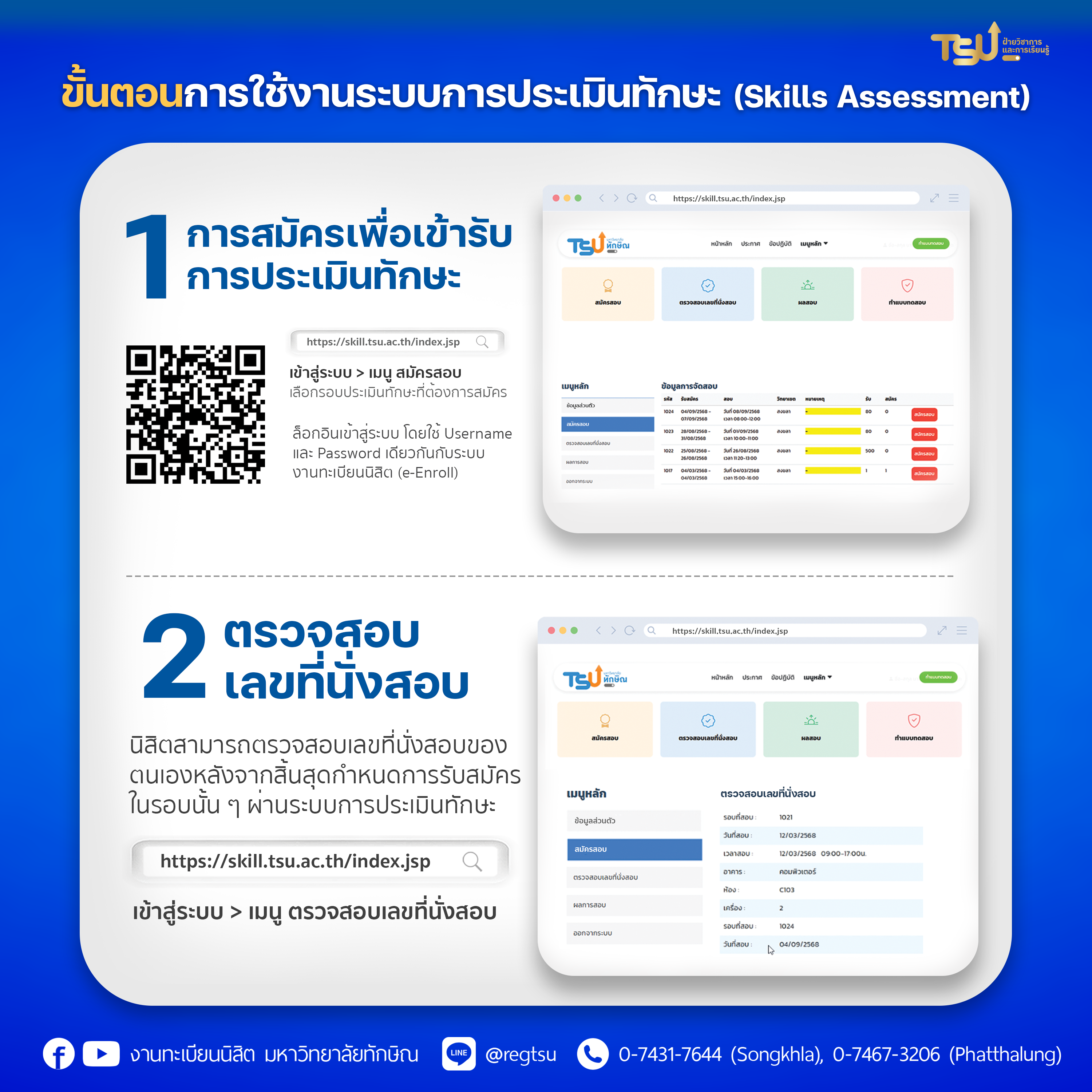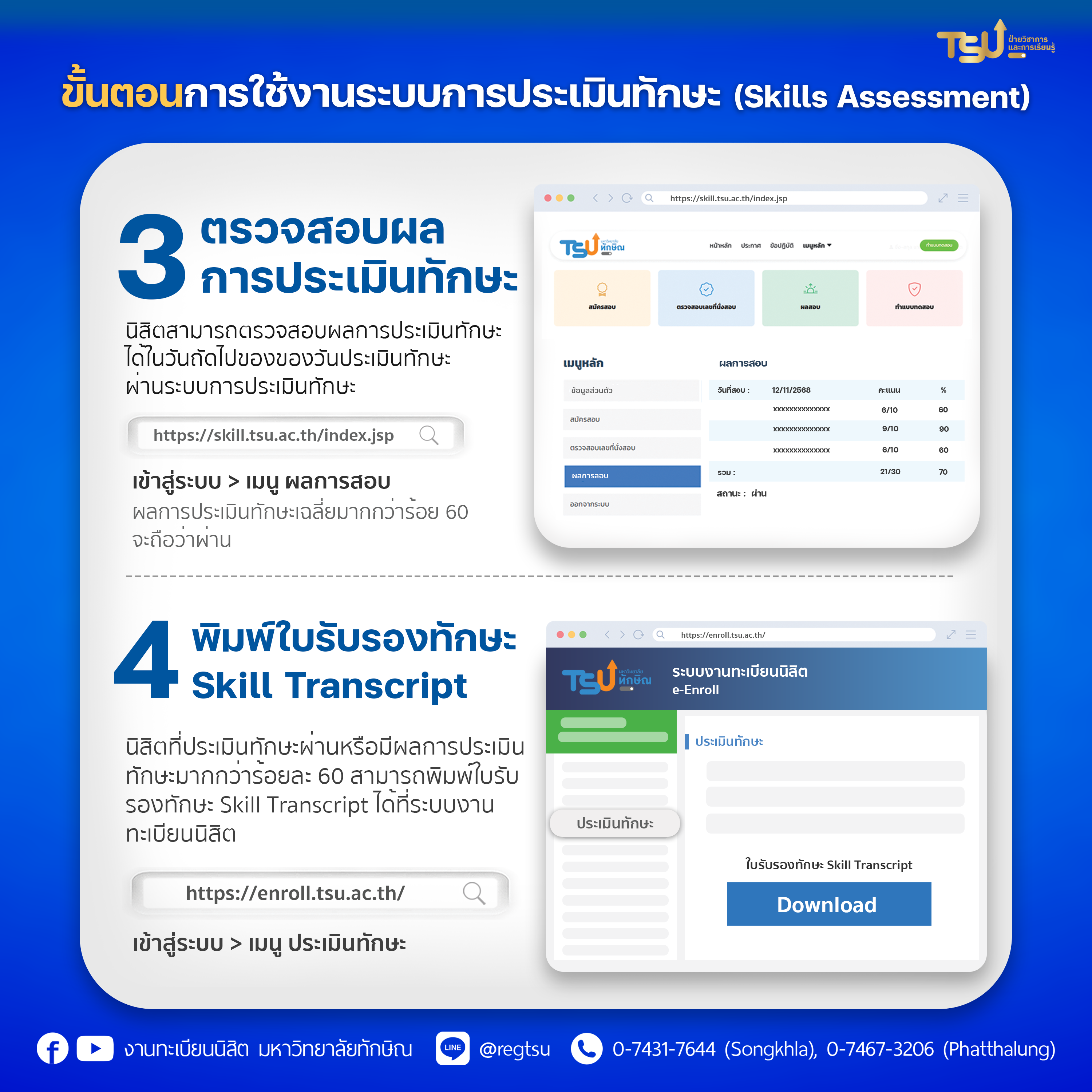 https://enroll.tsu.ac.th/ เข้าสู่ระบบ > เมนู ประเมินทักษะ