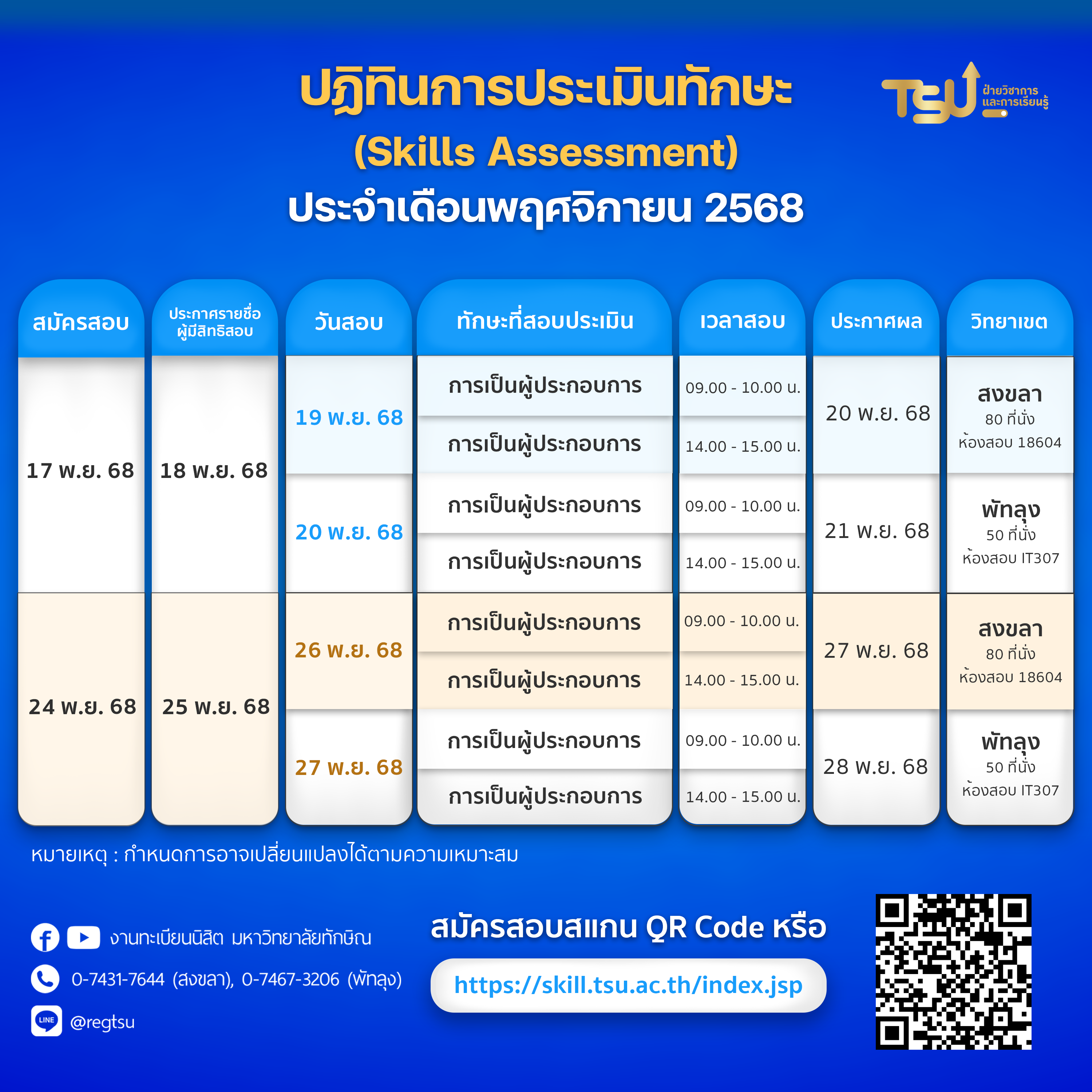 ปฏิทินการประเมินทักษะ (Skills Assessment) ประจำเดือนพฤศจิกายน 2568